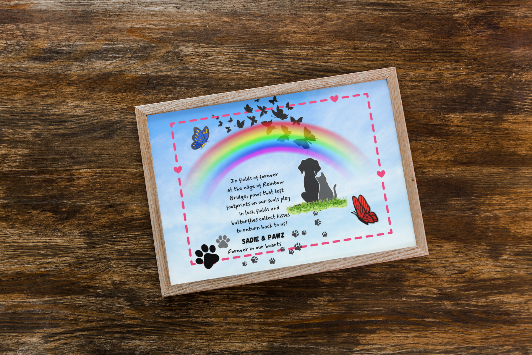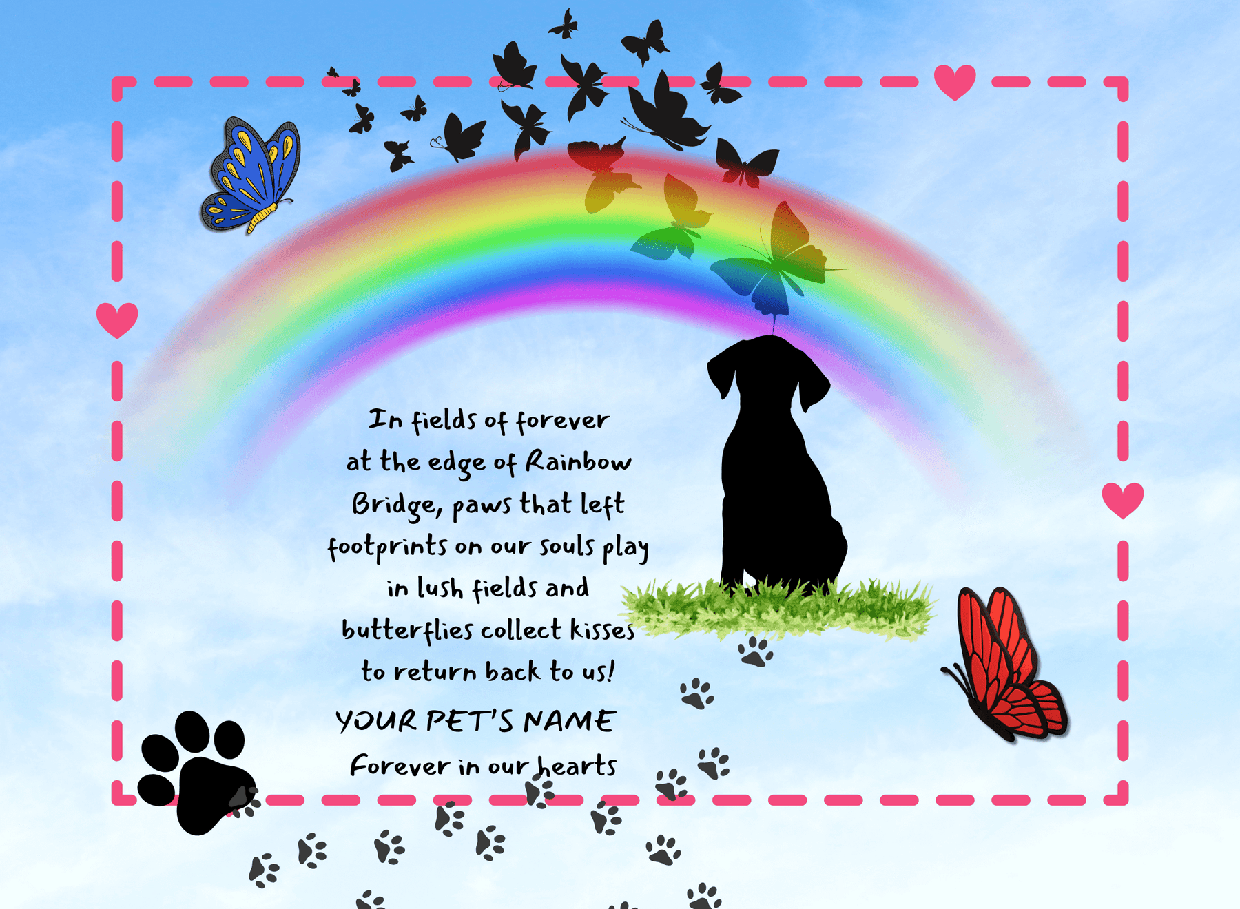 Each memorial piece includes thoughtful design, your pet’s personalized name, and an original poem written to hold space for remembrance, healing, and the enduring connection between pets and the humans who love them.