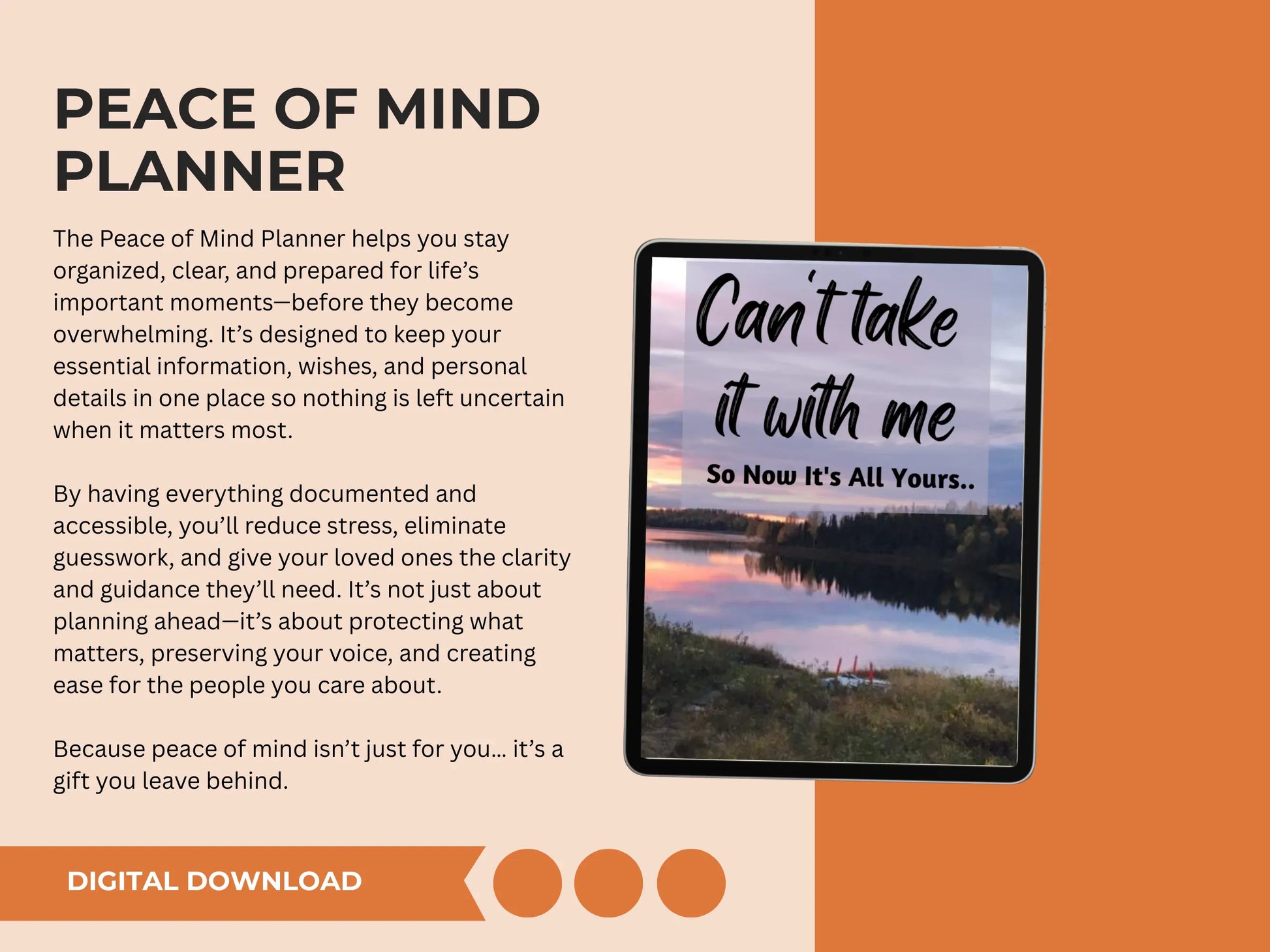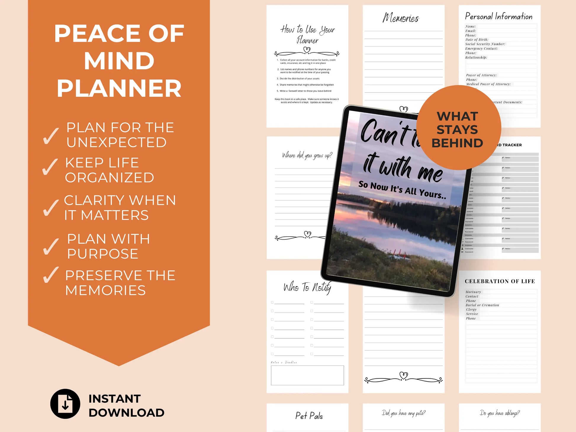 The Can’t Take It With Me Peace of Mind Planner is designed to help you sort through what truly matters—what needs to be handled, what should be passed on, and what can finally be let go. This planner provides a clear, organized space to document important details, decisions, and wishes, ensuring nothing meaningful is left unclear.