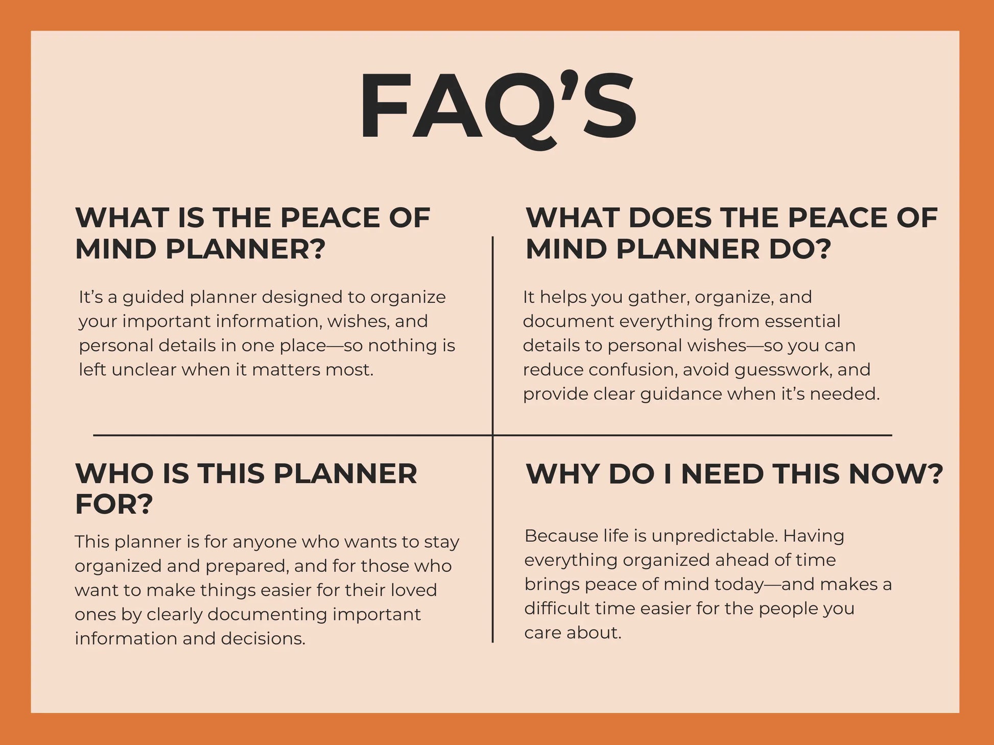 The Plot Twist Peace of Mind Planner is designed for life’s unexpected turns—the moments when plans change, circumstances shift, and clarity becomes essential. This planner helps you organize important information, document decisions, and regain a sense of control when the story doesn’t unfold the way you expected.